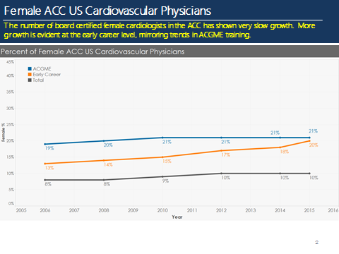 PV: Over the past decade, numbers of male and female trainees during medical school years are approximately equal. However, the percentage of female trainees drops as we go into a specialty field like cardiology and further into its sub-specialties particularly interventional cardiology and electrophysiology. A surprising fact is that only 20 percent of cardiology FITs and a mere 9 percent of interventional cardiology FITs are women. Even more surprising is that only 10 percent of Board certified cardiologist members of the ACC are women. What do you think is the main reason behind these gender differences and how can we decrease this gap?