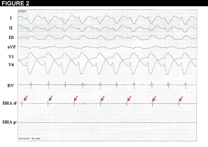Figure 2 gives the explanation to the enigma. HRA p and d (proximal and distal High Right Atrium) and RV (Right Ventricle) channels show the electrograms originating in the right atrium and in the right ventricle, respectively. The number of ventricular electrograms (RV channel) is clearly superior to the number of atrial electrograms (red arrows on HRAd channel), indicating a dissociation in the activation of the atria and the ventricles, which makes ventricular tachycardia the most probable diagnosis.
