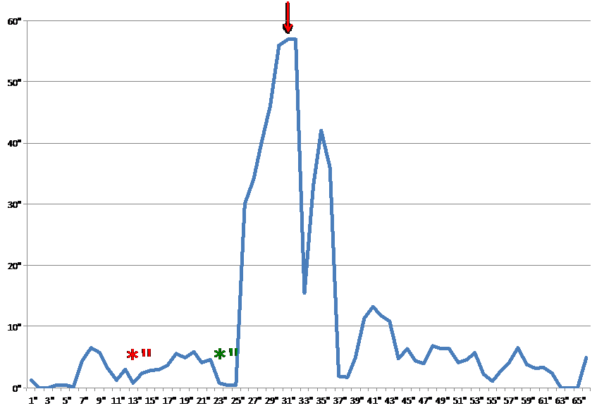 Figure 1: Eosinophilic response during dobutamine administration. Dobutmine was started at a rate of 5mcg/kg/min (red asterisk), then increased to 8.5mcg/kg/min (green asterisk) and discontinued (red arrow).