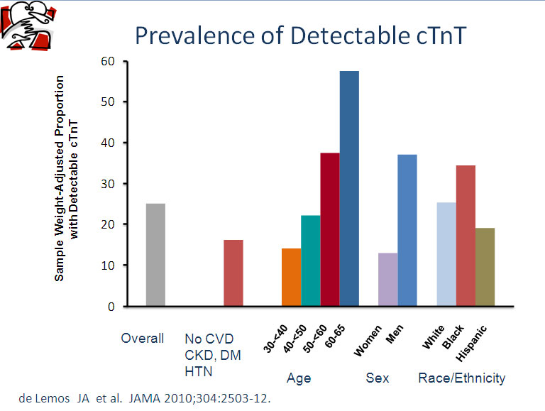 - de Lemos JA, Drazner MH, Omland T, et al. Association of troponin T detected with a highly sensitive assay and cardiac structure and mortality risk in the general population. JAMA 2010;304:2503-12.