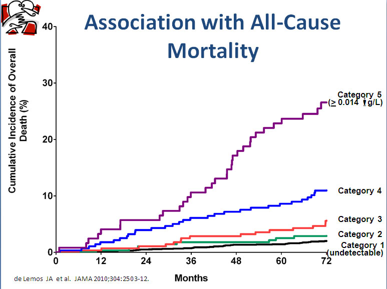 In the DHS trial, cTnT correlated independently with parameters reflecting structural heart disease, including magnetic resonance imaging-determined LV hypertrophy and LV dysfunction, as well as with renal function. In contrast, coronary calcium, and prior MI or angina, were not predictive of cTnT elevation. These findings again suggest that cTnT is a measure of structural heart disease rather than ischemic risk in stable outpatients. Across categories of increasing cTnT, mortality increased >15-fold (Figure 2), an association that remained significant after adjusting for standard risk factors, renal function, CRP, and NT-proBNP.5