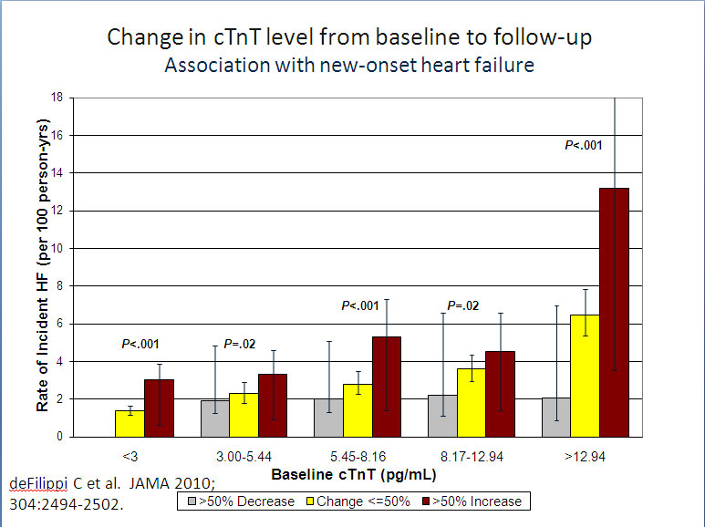 Moreover, a follow-up measurement performed 4 months later added prognostic information to the baseline measurement, suggesting that serial measurements of troponin levels with a highly sensitive assay may help to assess disease progression and response to therapy among patients with chronic HF.